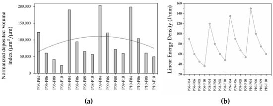 Digital microscopy analysis of the CSTs enables evaluation of track geometry and surface topology. These factors contribute to coating integrity and play a significant part in ensuring the Colmonoy material is distributed uniformly across the 304 SS surface. As illustrated in Figure 7, the normalized deposited volume over the build plate () shows the classical dependency related to laser power and scanning speed. Particularly for each laser power condition, the values decrease with decreasing scanning speed.