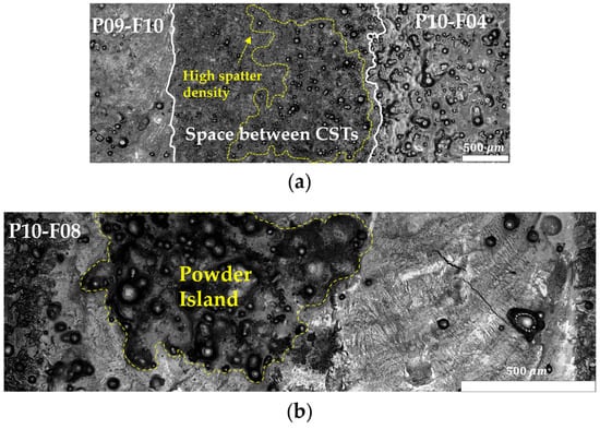 - XZ plane analysis (): the analysis of profile asymmetry highlighted good stability in process parameters for most CSTs. A certain deviation has been observed for P06-F10 compared to the other conditions with the same laser power (). This behavior can be attributed to the insufficient linear energy density related to the F06-P10 condition. In particular, the laser power is not high enough to prevent the instability of molten metal fluid generated by the high scanning speed, which leads to Rayleigh-Plateau instability phenomena [55,56]. Various explanations can be attributed to the conditions of P10-Fn CSTs; as these conditions are characterized by higher laser power, phenomena such as recoil pressure [57,58] and particle disintegration [57] take precedence over process stability, resulting in extreme asymmetry of the CSTs. In particular, the combined effects of recoil pressure and powder evaporation, which are generated by an intense laser source, result in a smaller amount of material being added to the melt pool. Furthermore, the recoil pressure accelerates partially melted particles to such an extent that they are shredded into multiple spatters and deviated from their nominal trajectory by shearing forces, as can be seen in Figure 9a. Additionally, particles that reach the melt pool without being overheated, deviated, or shredded form an island of powder that starts rotating towards the left edge of the CST, pushed by the Marangoni effect [59], as shown in Figure 9b. This phenomenon was also highlighted by Prasad et al. [60]. These two behaviors, when combined, explain the total asymmetry of the CSTs generated with a laser power of 1000 W.