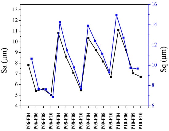 The roughness parameters Sa and Sq were extracted from the surface profile of the coated tracks after selective filtering. As illustrated in Figure 10, the resulting values exhibited trend consistency between the two parameters, as well as with the mean and maximum height. This indicates adequate material distribution over the surface with no significant outliers or evidence of highly non-Gaussian distribution. The CSTs designated P06-F06, P06-F08, P06-F10, and P08-F10 exhibited lower roughness profiles, with Sa values of 5.39, 5.55, 5.03, and 5.46 μm, respectively, and Sq values of 7.65, 7.62, 6.87, and 7.70 μm, respectively. The roughness values obtained are comparable with those obtained in DED deposition of other nickel alloys [64,65]. Furthermore, the typical decrease in roughness generated by decreasing energy input through increased scanning velocity is clearly evident [66,67].