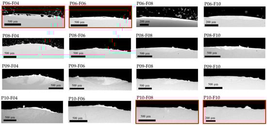 The objective of this research is to develop a coating that adheres optimally and is uniformly distributed across the deposited area. As can be seen in Figure 11, the least favorable conditions are highlighted in red. It is also worth noting that none of the process parameters selected for the DOE in Table 2 resulted in keyhole mode. The highest porosity levels were observed in conditions P06-04 and P06-06. The presence of other black areas in the CSTs can be attributed to dirt adhering to the cross sections. This was verified using secondary electron (SE) imaging.