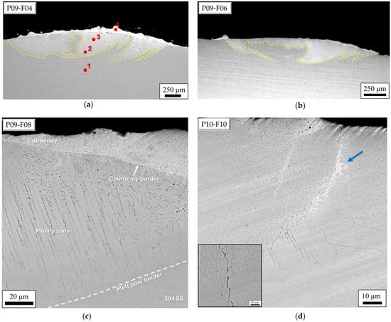 SEM-BSE details of the melt pool complex conditions of (a) P09-F04 and (b) P09-F06 and highlight of conditions P09-F08 (c) and P10-F10 (d).