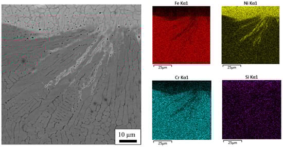 The inset in Figure 12d shows cracks appearing in different locations of the CSTs. The majority of these cracks arise in the P10 CSTs (lines 13–16 of Table 2). Micrometric pores between dendrites were spotted on all the deposited CSTs. These cracks can be identified as shrinkage porosity, a well-known defect in metal castings which arises from volumetric contraction of solid metal during the final stages of solidification [67]. Due to the fast cooling rates typical of metal additive manufacturing, dendritic growth is commonly observed, and the critical dimension of the dendrites, as well as the primary and secondary arm spacing values, can vary significantly according to the fabrication technology and the materials used. As the metal cools, the dendrites or cells solidify and undergo volumetric contraction. This decrease in volume results in a reduction in the pressure of the liquid between the dendrites or cells (i.e., interdendritic or intercellular liquid). The resulting low-pressure pockets then promote the formation of voids. Directional solidification (see Figure 12 and Figure 13) is promoted by the steep thermal gradient due to the localized thermal energy delivered by the laser source and coupled with the cold 304 SS substrate interaction. Upon solidification, the volumetric contraction is counterbalanced by the flow of liquid metal between dendrite arms and enhanced by the capillary forces [68,69,70]. Nickel depletion in the interdendritic areas, coupled with volumetric contraction and limited liquid metal supply due to the small amount of Colmonoy fed into the single scan tracks, causes shrinkage porosity. The results reported by Angelastro et al. [47] on bulk Colmonoy 227-F samples fabricated by laser cladding did not demonstrate this microstructural evolution in Ni-Fe-rich systems, nor was there any clear evidence of shrinkage porosity.