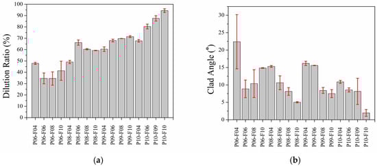 (a) Dilution ratio and (b) clad angle related to the various process parameters conditions.