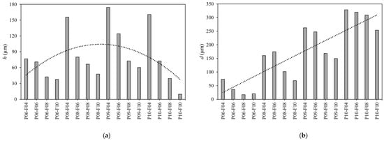 Concerning the dilution ratio, Mahamood et al. [77] highlighted that an increase in laser power is associated with an increase in dilution ratio. Similar results have been achieved by Gao et al. [74] and by Zhu et al. [78]. The correlation between scanning speed and dilution ratio is more difficult to establish. It should be noted that an increase in scanning speed is associated with a decrease in both the height of material below the substrate level (d) and the height of material above the substrate level (h), as illustrated in Figure 15. A similar trend has been highlighted by Carrozza et al. [79]. This means that the final effect of d and h on the dilution ratio is strictly associated with the slope by which these values decrease. As can be seen in Figure 15, the ratio by which h decreases is much higher than the ratio by which d decreases for P10-Fn conditions. By contrast, the ratios are similar for P08-Fn and P09-Fn conditions. The opposite trend is associated with the P06-Fn conditions and is related to the poor substrate remelting caused by the low laser power. Apart from the P06-Fn conditions, the dilution ratio is characterized by an overall increasing trend as the laser power and scanning speed increase.