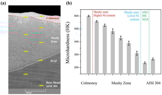 Nickel alloys have been identified as a potentially valuable solution for the surface reinforcement of stainless steels, with considerable promise in this regard [39,40]. The Colmonoy alloys, which are primarily composed of nickel, chromium, boron, silicon, and carbon, are classified depending on the precipitated hard phases (i.e., carbides and borides) within a nickel matrix. This combination of properties offers significant advantages in terms of hardness, corrosion resistance, and thermal stability [41,42]. The composition of these alloys can be modified to suit particular wear environments, thereby allowing for customization to specific requirements. The strength characteristics of the Colmonoy material can be altered by increasing the amount of chromium-rich phases, including chromium borides and carbides [43]. Furthermore, it is worth noting that the properties of Colmonoy coating layer depend on the deposition technique and parameters used, including thermal cycling during the coating process and the substrate’s chemical composition [44].