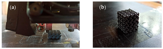 The cubic gyroid samples used in this study were fabricated via FFF, using a 3 mol% yttria-stabilized ceramic-based filament, Zetamix Black Zirconia (3Y-ZrO2), supplied by Nanoe®. As reported by the manufacturer, the filament consists of 50 vol% submicron ceramic particles (<1.0 μm) dispersed in a thermoplastic binder matrix. The material’s characteristic dark color results from the addition of cobalt iron oxide, (Co,Fe)2O4, with the final sintered components achieving a bending strength of at least 400 MPa [30].