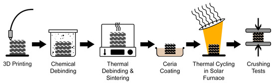 Following the 3D printing stage, the polymer binder was removed via a two-step debinding process. Initially, chemical debinding was performed by immersing the green parts in acetone at 40 °C for about 6 h, leading to a weight loss of 5–10%. This was followed by thermal debinding at approximately 500 °C over 30 h to eliminate the remaining binder. The samples were then sintered in a furnace at 1500 °C for 1.5 h. Controlled heating and cooling rates of 5 °C min−1 were applied, resulting in a total sintering cycle time of approximately 11 h. The experimental procedure, from sample production to the crushing tests, is illustrated in Figure 2.
