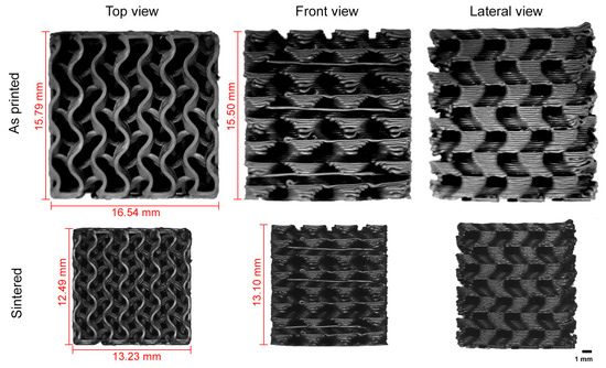 Figure 3 shows the as-printed and the sintered gyroid cuboid samples, with measurements showing a shrinkage of around 21% in the specimen’s cross-section and a significantly lower shrinkage of approximately 15% along its height. This value is aligned with the available literature [26,29] and was accounted for in the design and modeling stages of the cubic samples.