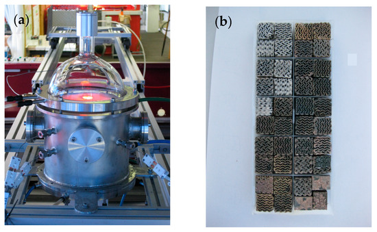 Overview of the SUNFUEL reactor upon cooling (a) and bird’s-eye view of the exposed samples after thermochemical cycling under the conditions investigated (b).