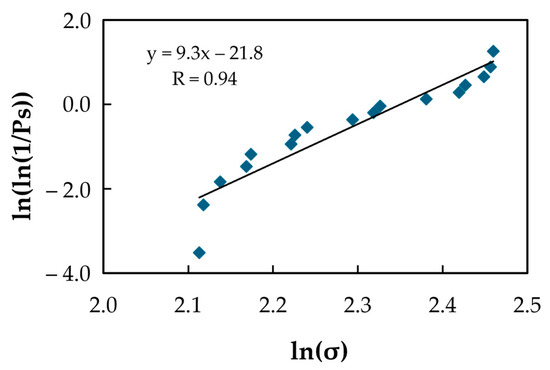 This equation describes a linear relationship between y and lnσ, where the slope corresponds to the Weibull modulus, m. In this method, a failure probability is assigned to each test sample. The experimental survival probability, Ps, is commonly estimated as [41]: