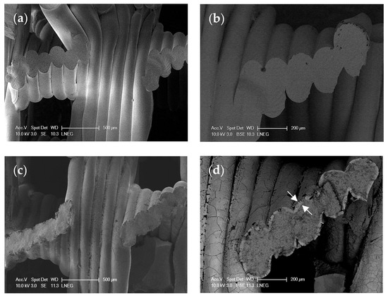SEM micrographs of fractured filament surfaces acquired in secondary electron (SE) and backscattered electron (BSE) modes. (a,b) correspond to the as-sintered (AS) sample, showing no detectable coating. (c,d) show a sample tested under Condition A. Arrows indicate the coating thickness (~50 μm).