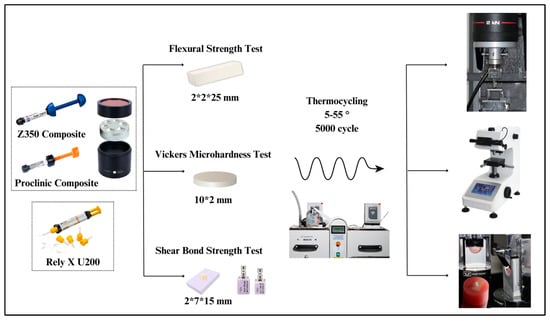 - Raposo, C.C.; Nery, L.M.S.; Carvalho, E.M.; Ferreira, P.V.C.; Ardenghi, D.M.; Bauer, J.; Lima, D.M. Effect of preheating on the physicochemical properties and bond strength of composite resins utilized as dental cements: An in vitro study. J. Prosthet. Dent. 2023, 129, 229.E1–229.E7. [Google Scholar] [CrossRef]