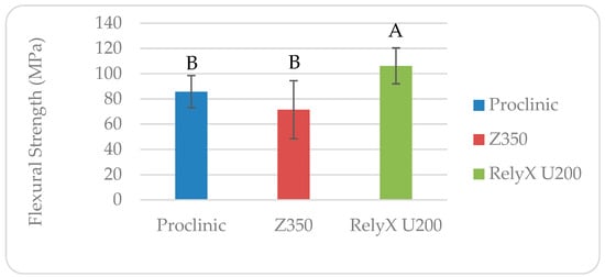 Flexural strength of different materials evaluated in this study. Similar letters indicate that the difference is not significant (p > 0.05).