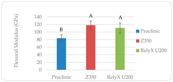Flexural modulus of different materials evaluated in this study. Similar letters indicate that the difference is not significant (p > 0.05).