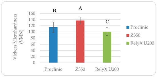 Vickers microhardness of the different materials evaluated in this study. Similar letters indicate that the difference is not significant (p > 0.05).