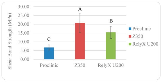 Shear bond strength of different materials evaluated in this study. Similar letters indicate that the difference is not significant (p > 0.05).