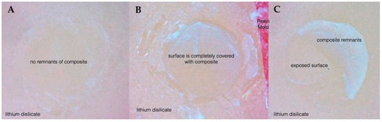 Modes of failure: (A) adhesive failure (completely exposed lithium disilicate surface), (B) cohesive failure (failure within the resin button), and (C) mixed failure (exposed lithium disilicate surface with remnants of resin).