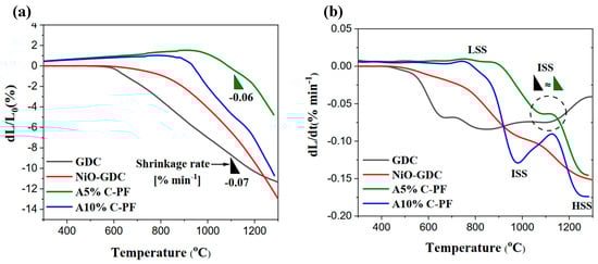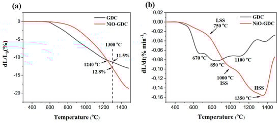 Figure 2 illustrates the sintering behaviour of the synthesised NiO-GDC and GDC powders before adding any pore former or making any preparations for the powders. Both samples start to shrink at temperatures around 600 °C with an onset sintering temperature around 500 °C (Figure 2b). However, the synthesised GDC reaches its maximum sintering rate at 850 °C, while the NiO-GDC achieves its highest sintering rate at temperatures as high as 1350 °C. A multistep densification behaviour can be clearly observed for the synthesised GDC sample. In addition to its main sintering peak at 850 °C, two shoulder peaks at 670 °C and 1100 °C can also be detected, each indicating a certain sintering process. During sintering, the contact between GDC particles first results in particle neck formation, followed by densification and grain growth [38]. At the initial sintering stage, low temperatures and mass transport mechanisms mainly occur at the surface and grain boundaries. Thus, the number of contacts between the particles, which depends significantly on the GDC powder’s initial particle and pore size, is of great importance. However, during both the intermediate and final stages of sintering, the densification can be significantly altered by the pinning effects of porosity [39].