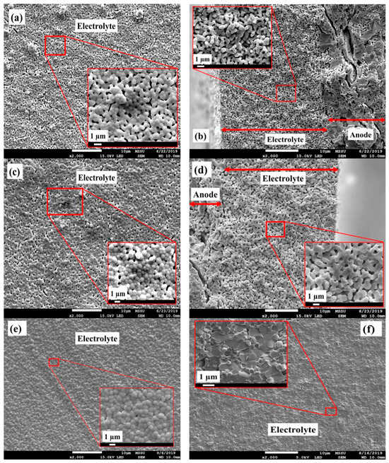 As an important component of SOFCs, the electrolyte layer should demonstrate a high level of densification to successfully separate the fuel gas from the air. Figure 4a–d present the FESEM images of the GDC electrolyte films deposited on A5%C-PF and A10%C-PF anode substrates after co-sintering at 1300 °C. For comparison purposes, the FESEM micrographs of the pelletised GDC electrolyte after densification at 1300 °C are also presented (Figure 4e,f). For both A5%C-PF and A10%C-PF substrates, the GDC membranes were rather porous after co-sintering, suggesting the need for higher sintering temperatures. However, it can be seen in Figure 4e,f that the pelletised GDC electrolyte reaches high densification levels at 1300 °C (over 94% relative density), which itself shows the high sinteractivity of the synthesised GDC electrolyte. Thus, considering the small linear shrinkage mismatch between A10%C-PF substrate and GDC powder, along with the relatively high sintering rate of A10%C-PF at ISS and HSS, one would assume a much higher electrolyte densification for the GDC/A10%C-PF bilayer. However, on the contrary, the co-fired GDC/A5%C-PF bilayer with a significantly larger shrinkage mismatch illustrated a much higher densification for the electrolyte membrane (Figure 4c,d).