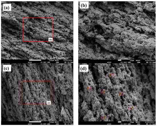FESEM images of A10%C-PF (a,b) and A5%C-PF (c,d) substrates, sintered at 1300 °C followed by reduction at 900 °C under hydrogen. Note: The red box shown in (a) has been magnified in (b), and similarly, the red box in (c) is magnified in (d). The arrows in (d) shows the higher number of randomly dispersed anisotropic pores with non-uniform size distribution, as explained in the last paragraph of page 11.