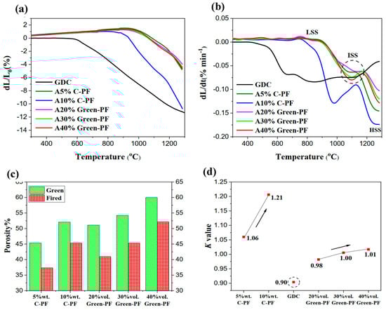 As can be observed, the synthesised GDC electrolyte illustrates higher shrinkage in the radial direction, whereas an opposite behaviour is observed for the A10%C-PF substrate, where the axial shrinkage is predominant. Thus, upon co-sintering of the GDC/A10%C-PF bilayer, the shrinkage occurs mostly in the direction perpendicular to the anode substrate (axial direction), where the in-plane shrinkage (radial shrinkage) of the thin electrolyte layer is inhibited by the external constraints imposed by the anisotropic shrinkage of the anode substrate. In fact, when the amount of C-PF pore former in the anode substrate was decreased to 5%, a more isotropic sintering behaviour (K = 1.06) was observed for the anode substrate, resulting in a higher densification of the thin GDC electrolyte film (Figure 4a,d). Such a change in the shrinkage behaviour of the anode substrate upon variation in the ratio of the pore former could be related to the morphological development of anisotropic pores through the addition of C-PF.