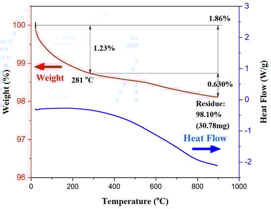Figure 8 shows the TGA/DSC analysis of the as-prepared Ni-GDC sample. Since the sample already underwent thermal decomposition, it mainly consists of metal oxides; therefore, the weight loss associated with increasing the temperature from 21 to 850 °C is primarily due to dehydration (below 281 °C, equivalent to 1.23 wt.%), followed by a degassing stage (0.63 wt.%). The volumetric change during the phase transformation of Ni-Ce-Gd-tartrate to NiO-GDC can develop micro-sized pores at the Green-PF sites, where the high exothermic character and the sudden release of a large amount of gaseous products during the burnout of Ni-Ce-Gd-tartrate precipitates (Figure 8) result in the formation of a highly porous and stable pore structure in the substrate. Thus, the porosity (ca. 40%), K value (0.98), resultant microstructure and sintering behaviour (shrinkage and rate) of the A20%Green-PF substrate were considered to satisfy the requirements for both electrolyte densification during co-firing and the fabrication of high-performance anode-supported SOFCs.