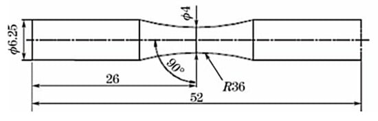 Creep testing was conducted using CTM-series elevated-temperature creep rupture testing systems, equipped with a three-zone temperature monitoring system. Specimens were thermally stabilized (10 min holding at target temperature) before load application, and data was acquired at 5 min−1 intervals until fracture. The geometry of the creep specimen is shown in Figure 1. High-cycle rotational bending fatigue tests were performed on machined specimens (Figure 2) using a QWP-10000 rotating-beam fatigue testing machine. The fatigue endurance limit (107 cycles) was determined using the staircase method under 760 °C testing conditions with a sinusoidal waveform (stress ratio R = −1) at a rotational speed of 5000 r/min.