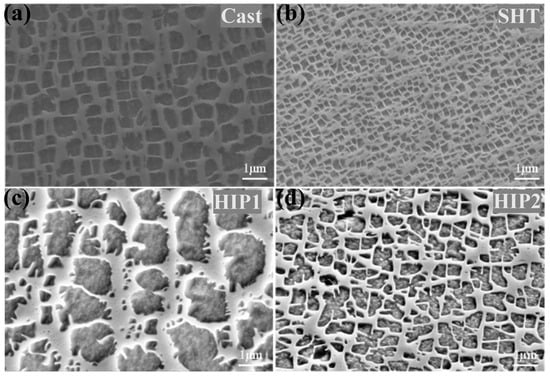 The dimensional characteristics and morphological distribution of γ′ phases are strongly influenced by thermal processing parameters, including temperature, pressure, and cooling rate []. Typically, γ′ precipitate dimensions are governed by cooling kinetics, showing an inverse relationship between particle size and cooling velocity. Following standard solution heat treatment with air cooling, the rapid thermal dissipation promotes the precipitation of refined γ′ phases. In contrast, furnace cooling after hot isostatic pressing (HIP) enables γ′ coalescence and coarsening through prolonged thermal exposure, resulting in heterogeneous γ′ morphologies with enlarged dimensions (Figure 3c). Comparative analysis reveals that HIP1-treated specimens (1180 °C) contain coarser γ′ precipitates than HIP2-processed counterparts (1240 °C), as shown in Figure 3c,d. This phenomenon is attributed to incomplete γ′ dissolution during HIP1 treatment, where residual precipitates merge with newly formed phases during subsequent cooling. The experimental findings confirm that accelerated cooling rates suppress γ′ growth through kinetic constraints, while gradual cooling facilitates particle coarsening. Moreover, higher HIP temperatures (HIP2 at 1240 °C) enable near-complete dissolution of γ′ phases, facilitating homogeneous reprecipitation during controlled cooling with improved dimensional uniformity (Figure 3d).