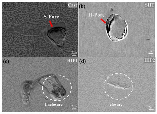 The typical micropores in K417G alloys under different conditions. (a) Cast; (b) SHT, 1240 °C/4 h; (c) HIP1, 1180 °C/160 MPa/4 h; (d) HIP2, 1240 °C/160 MPa/4 h.
