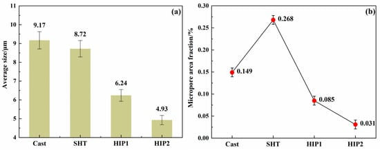 The micropores parameters of K417G alloys under different conditions. (a) Average size; (b) micropore area fraction.