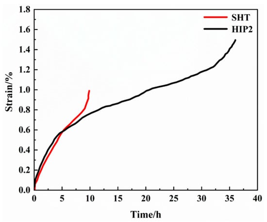 Figure 7 compares the creep performance of HIP-treated and solution-treated specimens under 760 °C/650 MPa conditions. The HIP-processed K417G alloy demonstrates superior creep resistance with a rupture life of 36.5 h and elongation of 1.6%, In contrast, the solution-treated specimens displays significantly reduced performance (9.9 h rupture life, 1.0% elongation). HIP treatment achieves remarkable improvements of 268.7% in creep duration and 60% in elongation compared to solution heat-treated specimens.