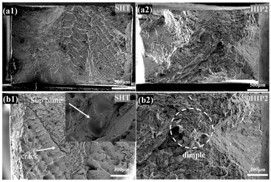 As shown in Figure 8b1, the solution-treated K417G alloy exhibited typical brittle fracture characteristics, with macro-fractography revealing distinct smooth shear zones and intergranular cracking. Micropores acted as stress concentration regions, promoting slip plane formation that interconnected with adjacent defects under loading. In contrast, HIP-treated specimens displayed a textured fracture surface with high-density dimple distribution, lacking intergranular fracture characteristics (Figure 8b2).