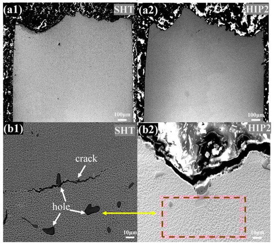 Figure 9 presents the longitudinal section of a creep fracture. Microdefects in stress concentration zones are the main cause of alloy creep deformation. As shown in Figure 9b1, SHT samples have many pores and small γ′ phase sizes. This increases matrix creep deformation resistance, creating stress concentration areas around pores []. It leads to pore growth, coalescence, and sample fracture. Figure 9b2 shows that after hot isostatic pressing, pores are eliminated, there are larger γ′ phase sizes, and creep deformation resistance is reduced. Stress concentration is limited to interdendritic carbides; as such, HIP2 samples achieve creep performance and fracture elongation, significantly increasing the time to creep fracture (Figure 7).