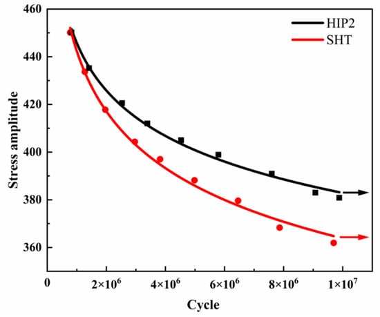 Fatigue failure constitutes a predominant failure mode in aero-engine turbine blades [,,]. This operational reality necessitates systematically evaluating the K417G superalloy′s fatigue performance across different processing states to elucidate heat treatment effects. Figure 10 presents rotating bending fatigue S-N curves for smooth specimens, demonstrating a strong correlation between applied stress and fatigue life. At 450 MPa, minimal life disparity exists between solution heat-treated (SHT) and hot isostatically pressed (HIP2) specimens. However, significant divergence emerges with decreasing stress levels: SHT specimens withstand over 1.0 × 107 cycles without fracture at 360 MPa, while HIP-treated counterparts achieve their fatigue limit (≥1.0 × 107 cycles) at 380 MPa, achieving a 20 MPa enhancement in fatigue endurance limit through HIP treatment (Figure 10).