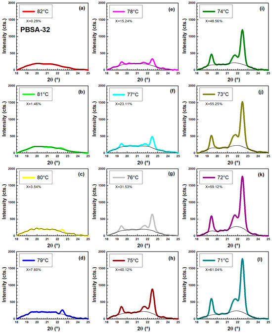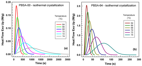 Figure 1 illustrates the influence of temperature on the isothermal crystallization traces monitored by DSC. Figure 1a presents data for the unhydrolyzed PBSA sample, with isothermal temperatures ranging from 64 to 74 °C. At the highest temperature (74 °C), it took more than 3000 s to complete the experiment. The most rapid crystallization occurred at 64 °C, with kinetics progressively slowing as the temperature increased. Concurrently, the peak height systematically decreased with increasing crystallization temperature. We chose temperatures within the 64–74 °C range for practical reasons. Below this range, the polymer began to crystallize even during rapid cooling at 50 °C/min. Conversely, at temperatures above 74 °C, crystallization became impractically long, extending over several hours.
