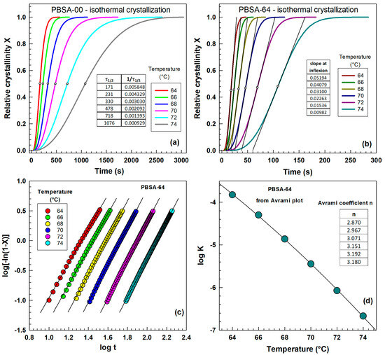 Influence of isothermal crystallization temperature on relative crystallinity curves from differential scanning calorimetry (DSC) for (a) PBSA-00 sample (0 days of hydrolysis), (b) PBSA-64 sample (64 days of hydrolysis at 70 °C), (c) PBSA-64 sample (Avrami plot), and (d) PBSA-64 sample (Avrami rate constant K and exponent n).