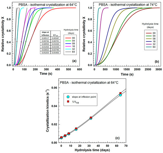 Influence of hydrolysis time at 70 °C on relative crystallinity from differential scanning calorimetry (DSC) for isothermal crystallization temperatures. (a) 64 °C. (b) 74 °C. (c) Crystallization kinetics at 64 °C.