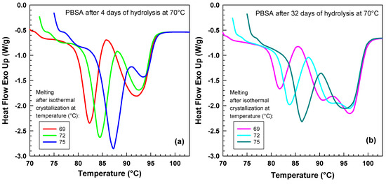 Heat flow curves during the heating experiment at rate 20 °C/min after isothermal crystallization at various temperatures. (a) PBSA after 4 days of hydrolysis at 70 °C. (b) PBSA after 32 days of hydrolysis at 70 °C. Each curve represents data obtained at crystallization temperatures of 69 °C to 75 °C indicated in the legend.