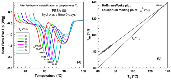 Heat flow curves during the heating experiment at rate 20 °C/min after isothermal crystallization at various temperatures. (a) PBSA hydrolysis time 0 days. Crystallization temperatures (64–74 °C) corresponding to each curve are listed in the legend. (b) Hoffman–Weeks plot for PBSA hydrolysis time 0 days, circle represents equilibrium melting point .