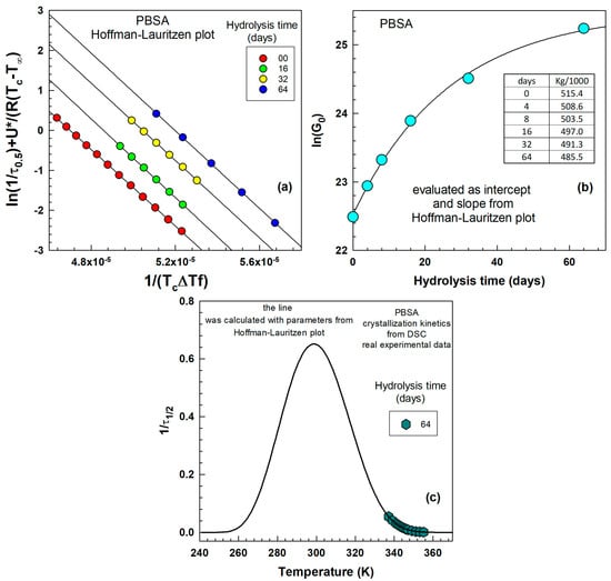 (a) Hoffman–Lauritzen plot for PBSA after 00, 16, 32, 64 days of hydrolysis, (b) pre-exponential factor as a function of hydrolysis time, (c) reciprocal half-time of crystallization as a function of temperature in K.