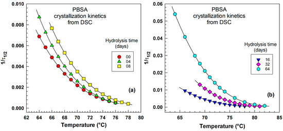 Crystallization kinetics as a function of temperature derived from DSC expressed as for various times of hydrolysis. (a) Hydrolysis time 00, 04, 08 days, (b) hydrolysis time 16, 32, 64 days. Each curve is associated with a specific hydrolysis duration, as indicated in the legend.