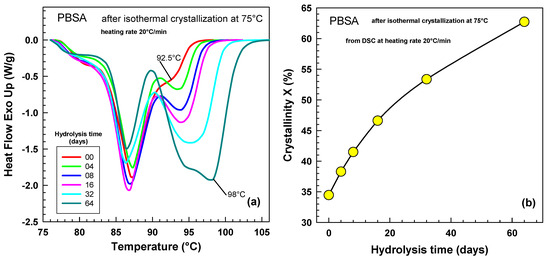 To simulate conditions relevant for biodegradation and composting, hydrolysis of PBSA was previously performed at 37 °C, 58 °C, and 70 °C in phosphate-buffered saline (PBS, pH ≈ 7.2), as detailed in our earlier study [22]. The weight loss values after 128 days at these temperatures were about 9, 54, and 72 wt. %, respectively. Corresponding shifts in crystallization temperature Tc were about 2, 12, and 25 °C, respectively. Hydrolysis at 70 °C led to the most pronounced changes in crystallization behavior and weight loss, which guided our decision to focus on samples hydrolyzed at 70 °C for 4, 8, 16, 32, and 64 days in the present work. The crystallization behavior of these degraded samples is analyzed in detail below.