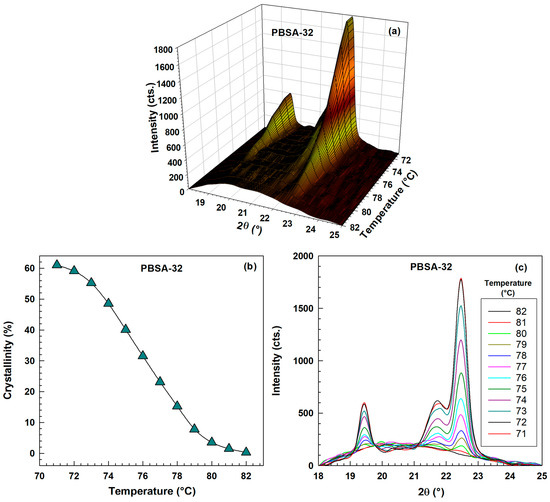 Figure 1b displays data for the sample hydrolyzed for 64 days, examined within the same temperature range. Notably, the experimental duration for this sample was significantly shorter, completing within approximately 300 s. Despite this difference in kinetics, the overall trends observed in Figure 1b closely mirror those of the unhydrolyzed PBSA sample.