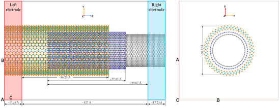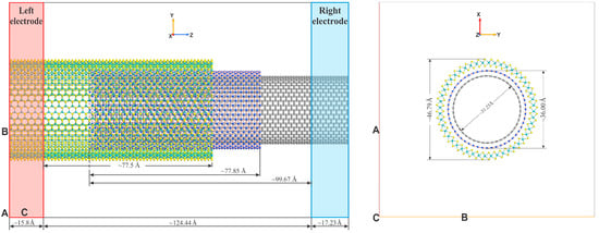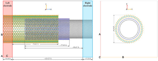 As is known, typical 1D vdW heterodevices consist of telescopically nested nanotubes with diameters ranging from 1 nm to 5 nm and exhibiting various types of electronic conductivity [48]. It is experimentally challenging to manipulate nanotubes with small diameters; therefore, in this study, nanotubes with diameters closer to 5 nm were selected. The most suitable combinations for the coaxial vdW coupling, enabling the formation of 1D vdW heterostructures, are as follows (see Figure 1, Figure 2 and Figure 3):