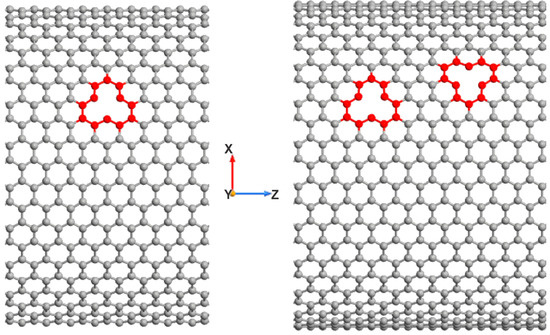 Another fundamental type of defect in the structure of CNTs is the vacancy defect (see Figure 6). In [83], the correlation between electrical properties and the vacancy density in monolayer CNTs was investigated, along with the dependence of the vacancy influence range on the nanotube’s chirality. The study also examined band structure fluctuations induced by nanotube deformation. In [84] it was further shown that both the geometry of the CNT and the presence of different types of vacancy defects can significantly affect its properties. Thus, the influence of structural imperfections in CNTs on the transport properties of 1D vdW heterostructures based on the MoX2 (X = chalcogen)–hBN–CNT is of considerable interest.