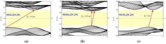 The band structure of MoX2(24,24) nanotubes calculated along the Γ–Z direction: (a) MoS2(24,24); (b) MoSe2(24,24); (c) MoTe2(24,24).