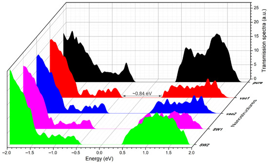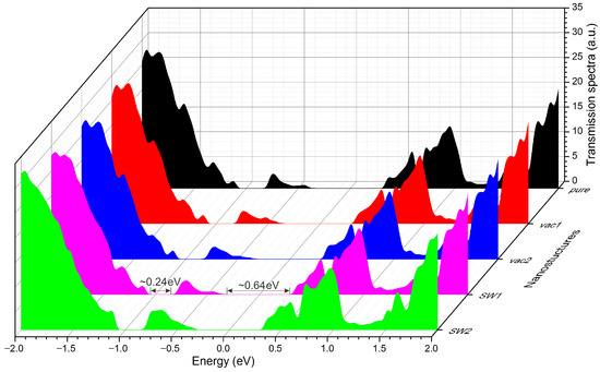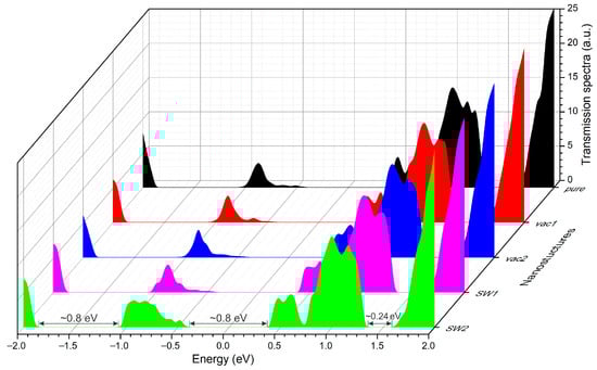 A different behavior is observed in the 1D vdW heterostructure, MoSe2(24,24)–hBN(27,27)–CNT(24,24). The calculated transmission spectrum of this heterostructure, including the previously considered defects, is shown in Figure 15. It can be seen that in the energy range of approximately −0.4 to 0.4 eV, the device blocks quasiparticle transport, forming a HOMO–LUMO gap of ~0.8 eV. Additional transmission suppression occurs in the ranges of ~−1.9 to −1.1 eV and ~1.34 to 1.58 eV. Compared to the transmission spectra of other nanosystems, this system exhibits a noticeable series of sharp peak structures, which is indicative of pronounced resonant effects.
