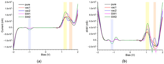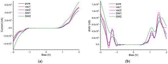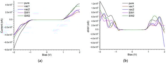 The nanosystem predominantly conducts the current in the forward bias direction, while under the reverse bias the current decreases by a factor of approximately 1.7 (Figure 14). For example, in the defect-free structure, the maximum current under the forward bias reaches ~46 μA, whereas under the reverse bias it is reduced to ~26 μA (Figure 14a, curve pure). This rectifying behavior enables the use of such devices for current modulation in nanoscale circuits [92,93]; i.e., this property allows them to be used as nanodiodes.