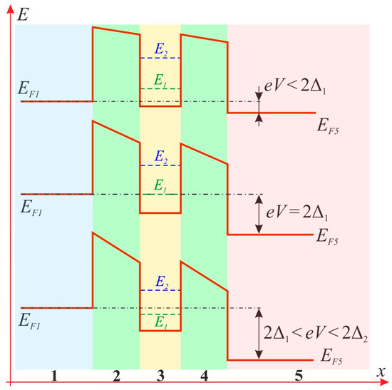 The calculated CVC and differential conductance for this system are presented in Figure 16a and16b, respectively. The CVC of the given nanostructure resembles that of a double tunnel barrier with a quantum-sized central region. To facilitate the explanation of the I–V behavior, its corresponding energy band diagram is presented in Figure 17. The ordinate represents the quasiparticle energy, while the abscissa denotes the spatial coordinate. In the energy diagram, the cathode and anode electrodes are labeled as 1 (blue) and 5 (red), respectively, with their corresponding Fermi levels, and , indicated. Regions 2 and 4 (green) represent the tunnel barriers, and region 3 (yellow) corresponds to the quantum-confined region. It is important to note that the electric potential applied between the cathode (1) and anode (5) drops across tunnel barriers 2 and 4, which is approximately equally distributed. As a result, the potential energy of quasiparticles in the anode region decreases by a certain amount , which causes a downward shift in all energy levels (Figure 17). In the quantum-confined region (3), the potential energy of electrons decreases by an amount of . Consequently, the allowed energy levels and also shift downward by the same amount. The upper part of the energy diagram corresponds to the case when , and here denotes the energy difference between the allowed levels in the quantum-confined region and the Fermi level . Under this condition, most quasiparticles from region 1 near the Fermi level do not find available energy levels in region 3. As a result, their tunneling through barrier 2 does not occur, and the tunnel current remains negligible.