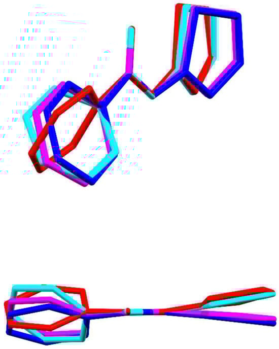 Two perspectives of the overlay of molecule 1 (magenta), molecule 2 (red), molecule 3 (blue) and molecule 4 (cyan) in the asymmetric unit of molecule polymorph III.